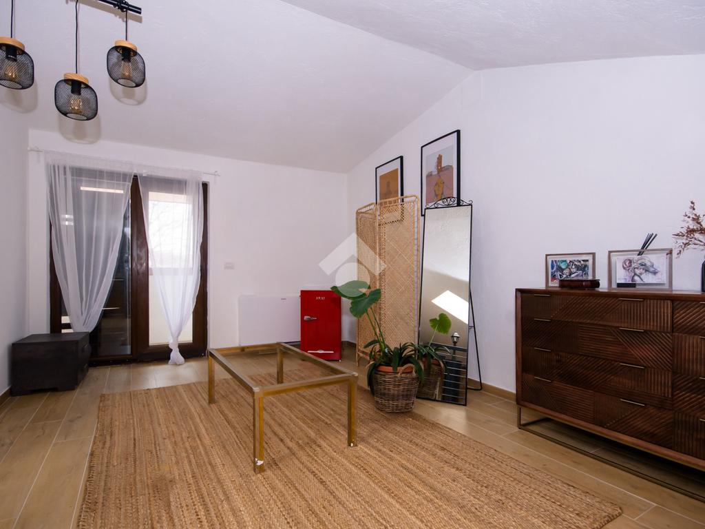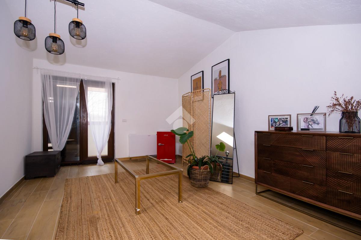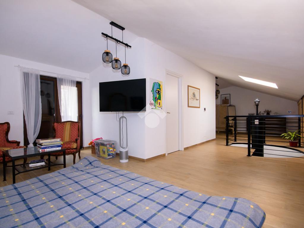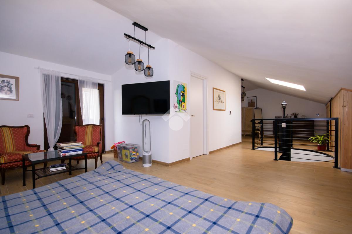 La scala interna conduce al piano superiore dove si apre una suggestiva suite open space progettata per accogliere la zona notte padronale con angolo relax, terrazzo privato con vista panoramica sulle colline e predisposizione per vasca a centro stanza, per un tocco di esclusività.